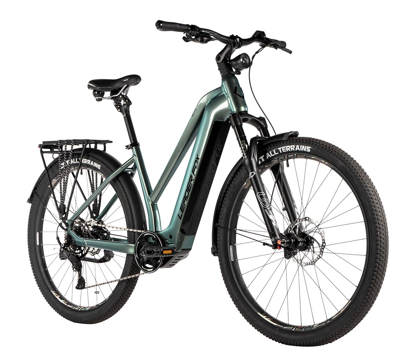 Dámsky krosový e-bike Leader Fox BEND 28" v hliníkovom ráme, odpružená predná vidlica RST, kotúčové brzdy, blatníky a zadný nosič. Všestranný na ceste aj v teréne.