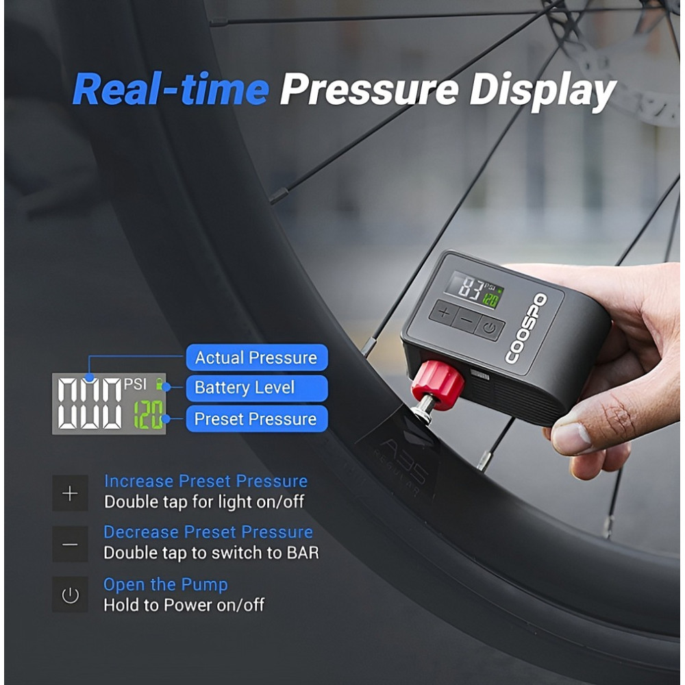 Veľkou výhodou AP-B1 je inteligentná funkcia automatického zastavenia. Na prehľadnom LCD displeji stačí nastaviť požadovaný tlak (napr. 30 PSI pre MTB alebo 90 PSI pre cestný bicykel) a kompresor sa po dosiahnutí tejto hodnoty sám vypne. To eliminuje riziko preťaženia, dohady a neustále kontrolovanie manometra.